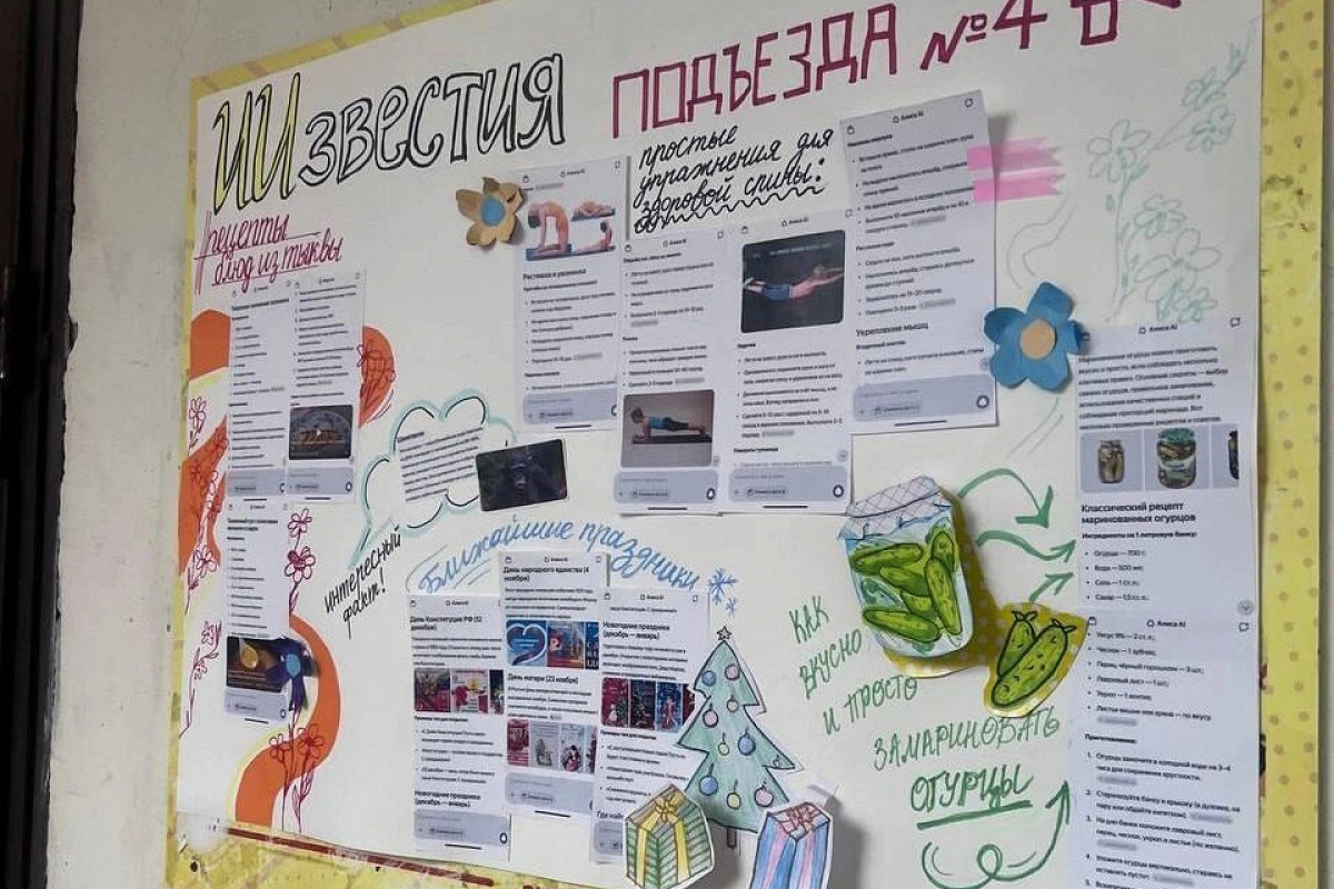 Каждый выпуск «ИИзвестий подъезда» — это несколько статей, оформленных авторскими рисунками и бумажной аппликацией. Контент пенсионерка создает с помощью нейросети «Алиса AI» от «Яндекса».