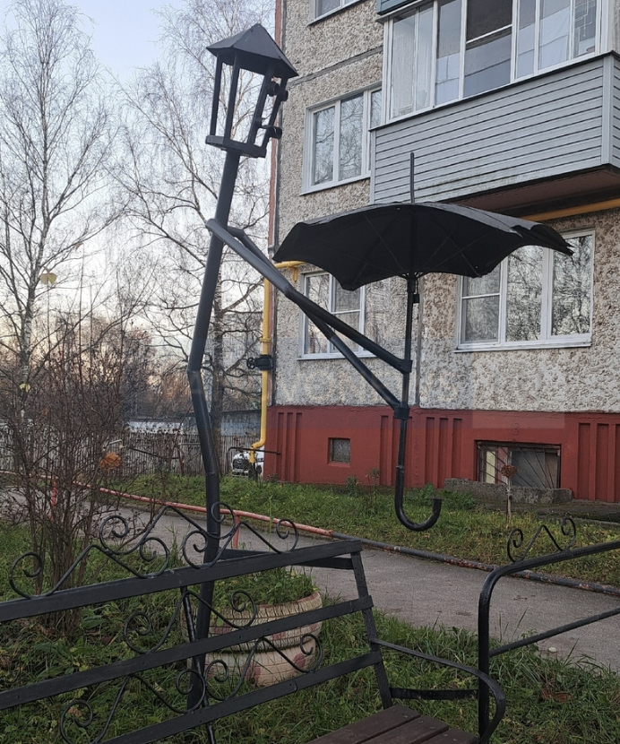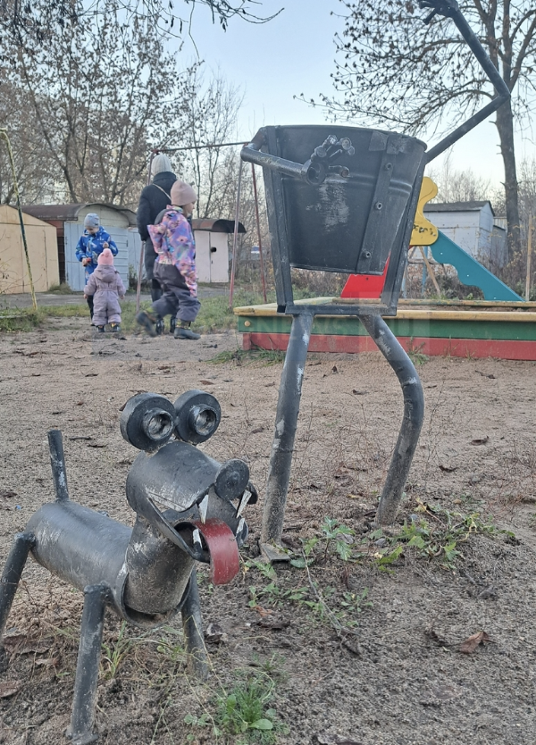Как рассказывает один из них, Герман Тарасов, все началось с деревянных фигур сказочных персонажей, но они за три года пришли в негодность – ольха оказалась недолговечным материалом, плохо переносящим осадки. Тогда внимание пенсионера и его соседа-напарника Александра Макарова привлекли металлические фигуры (аналог одной из них, например, красуется в центре Ярославля). Материал дорогой, поэтому добывали его, не брезгуя даже выброшенными на помойку мелочами, деталями.