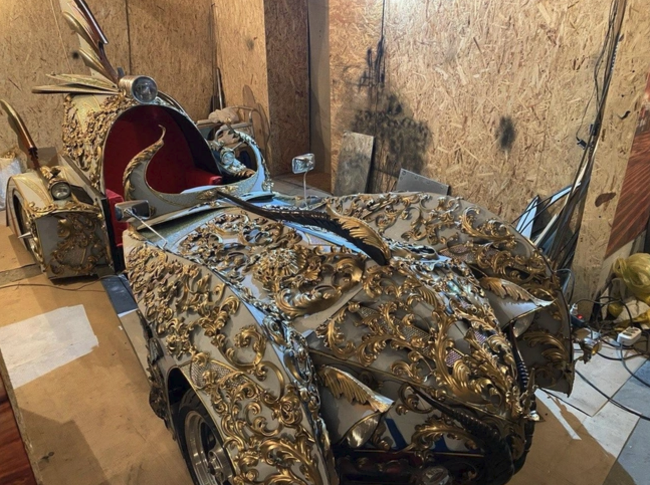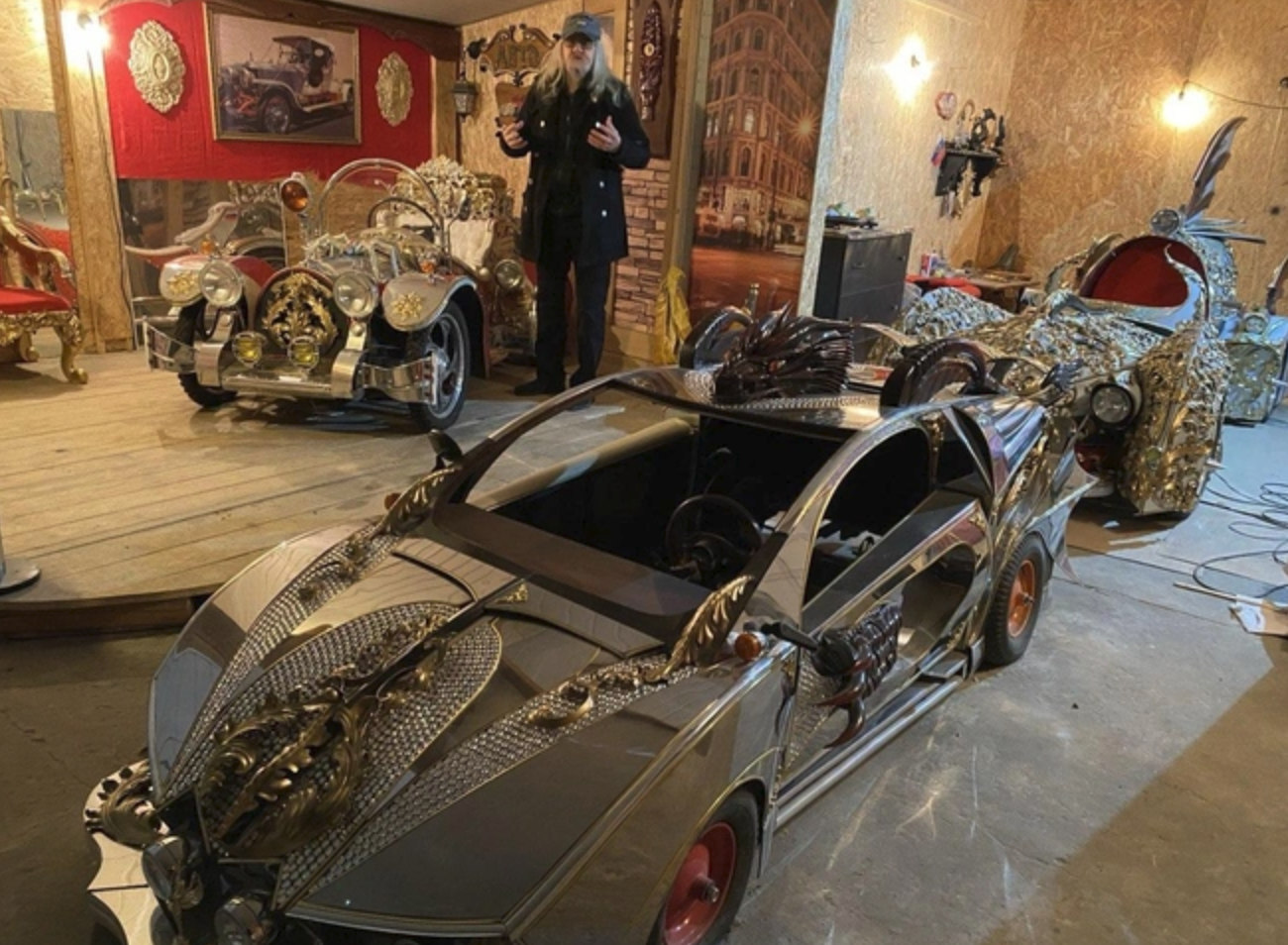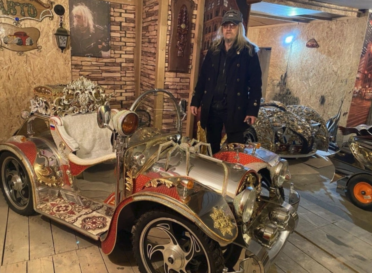 — Вот придумал я, какую машину хочу сделать, а места всё равно нету. И куда ее? На улице оставлять? А там, может, несколько килограммов только одних страз, которые я вручную каждую приклеивал, — объяснил он. Рад бы делать дальше, но делать скоро будет негде. Идей-то много: и трехколесные, и пятиколесные машины. Или, допустим, пожарный автомобиль длиной 20 метров. Такой весь крученый.