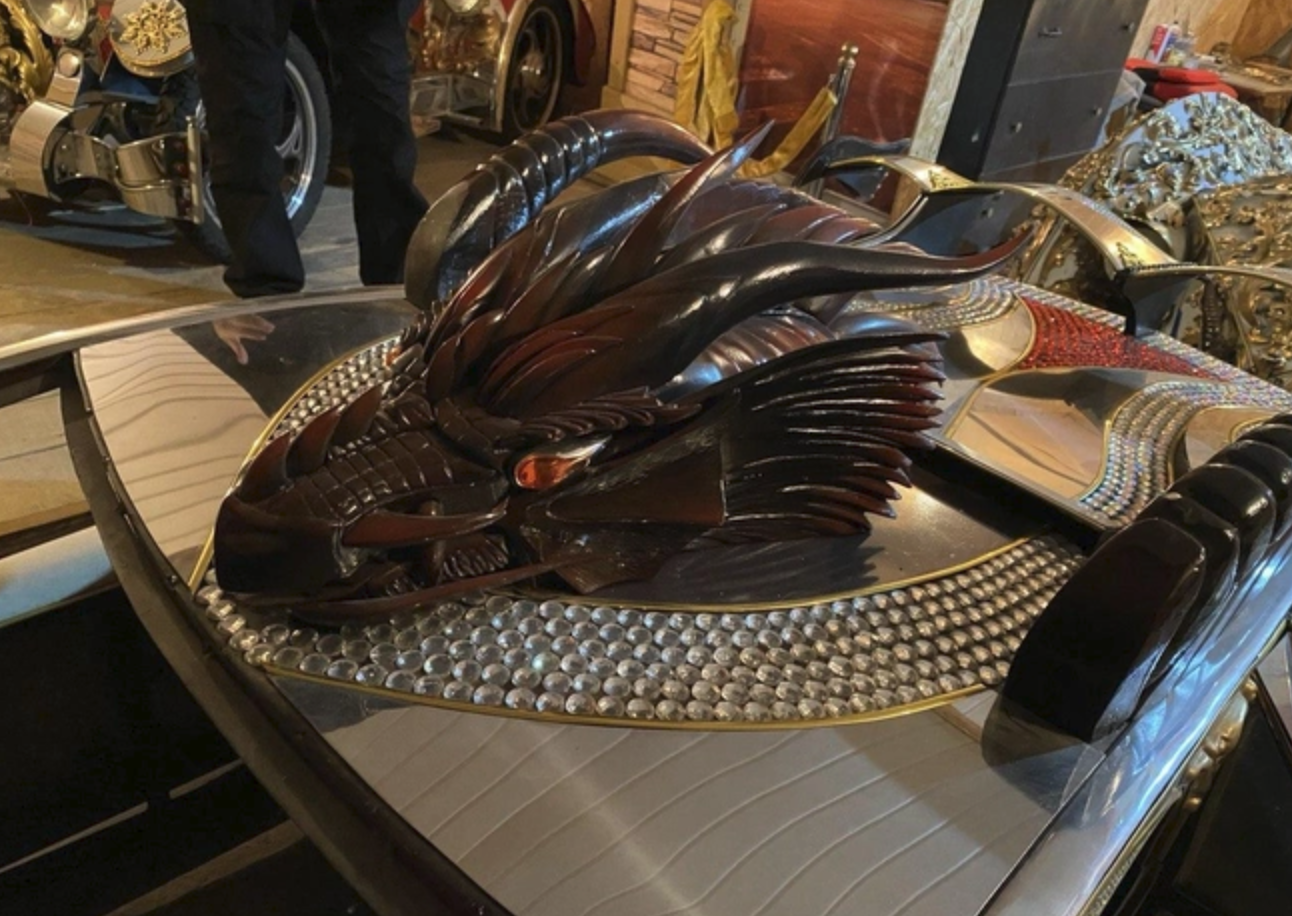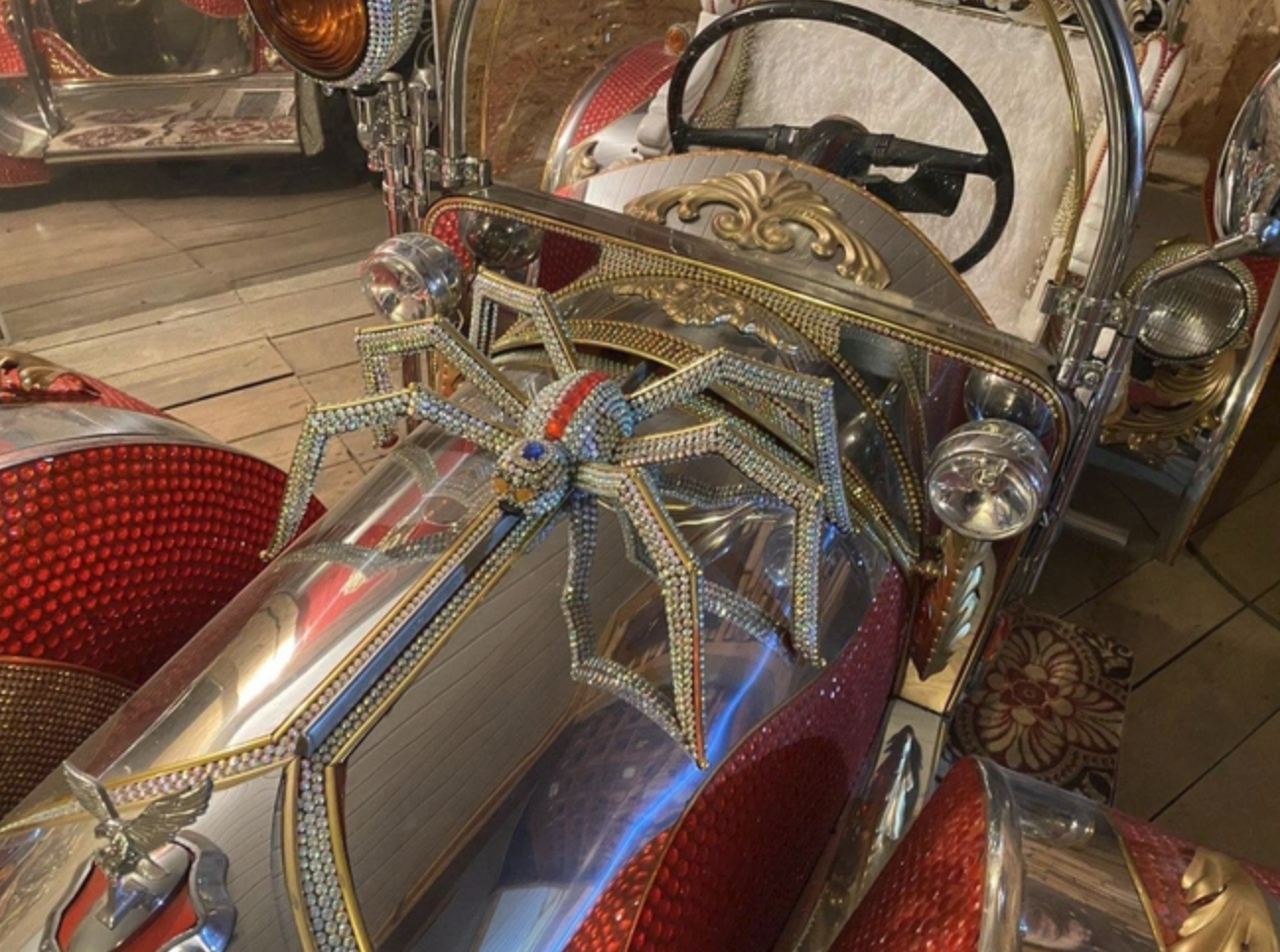 Одна из машин сделана по типу автомобиля-кабриолета рубежа 19–20 веков. Ее каркас сделан из светлого металла и начищен так, что там можно разглядеть собственное отражение. На капот Виктор усадил большого паука, который весь покрыт стразами. Другая машина уже выглядит как уменьшенная версия современного спорткара. Ее капот также украшен стразами, однако главная фишка модели — это голова дракона с ярко-красными глазами на крыше. Когтистыми лапами сказочного ящера также украшены двери авто.
