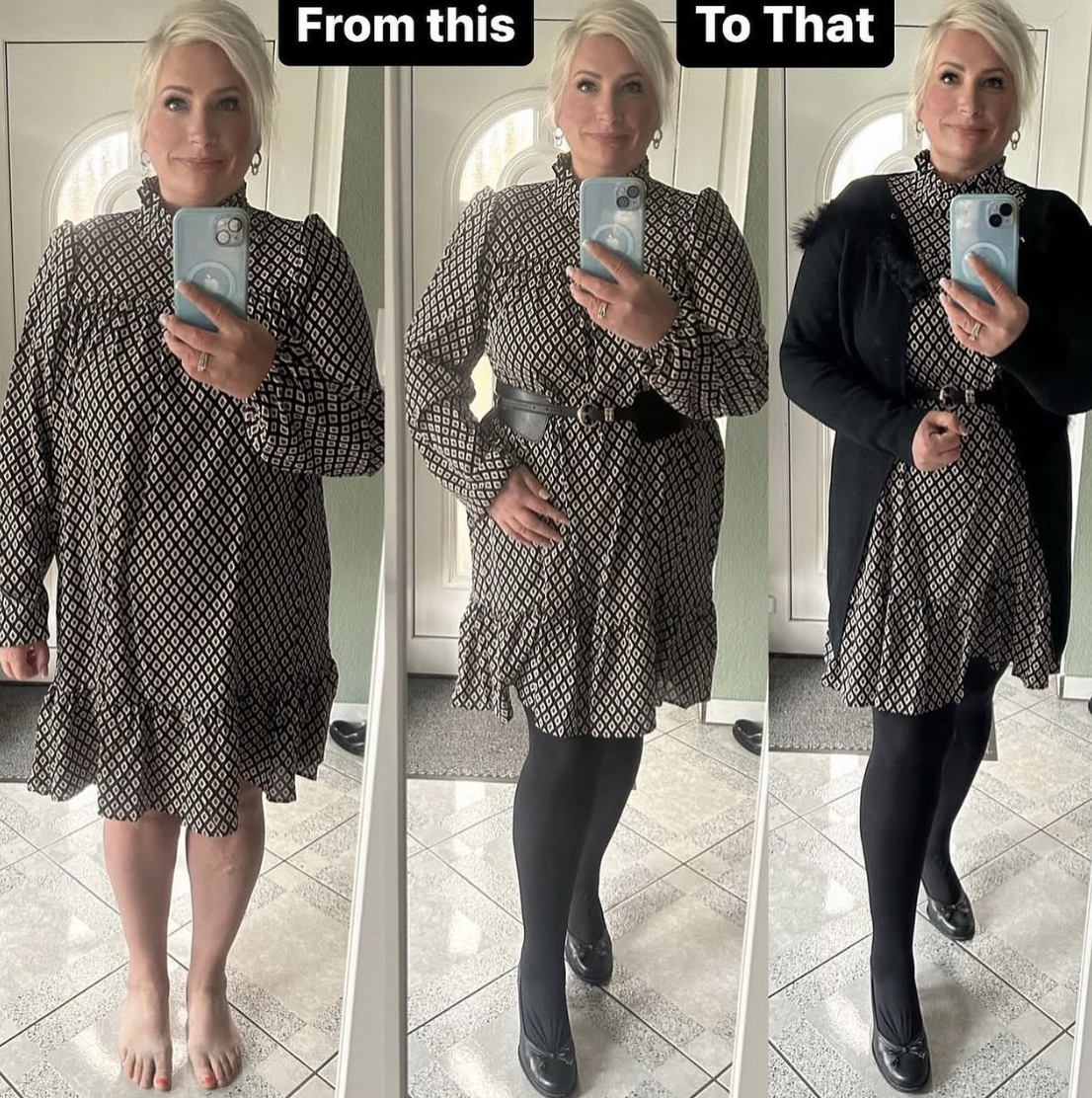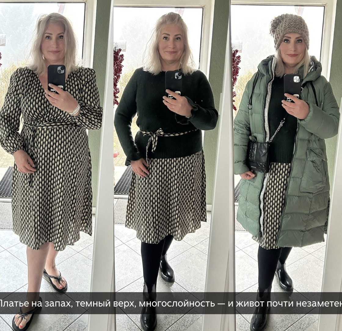 Казалось бы, безнадёжное платье, которое полнит. Закрытый воротник, который укорачивает шею и объём из-за сборки, которая расположена совсем неудачно. Но Джаннетт постаралась спасти ситуацию, добавив туда пояс, черные колготки и длинный кардиган. Конечно, смотрится неидеально. Но если есть любимое платье, которое теперь полнит, можно реабилитировать его таким способом.