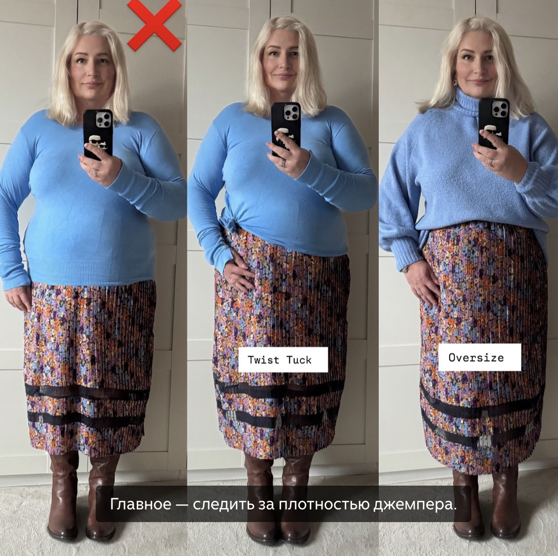 Например, здесь изображен один из излюбленных приёмов — акцентировать талию с помощью подвёрнутого или заправленного свитера. Да, это работает, даже в том случае, если есть сильно выступающий живот. Но обратите внимание на материал джемпера — здесь скрыта вся соль. Облегающий трикотаж с эластаном подчеркивает недостатки, даже если его подвернуть или соорудить узел. Но стоит только заменить на более плотный свитер из шерсти или акрила — результат налицо. Главное, чтобы свитер не был слишком толстым — так он будет выделяться из-под юбки и лишь добавлять объем.