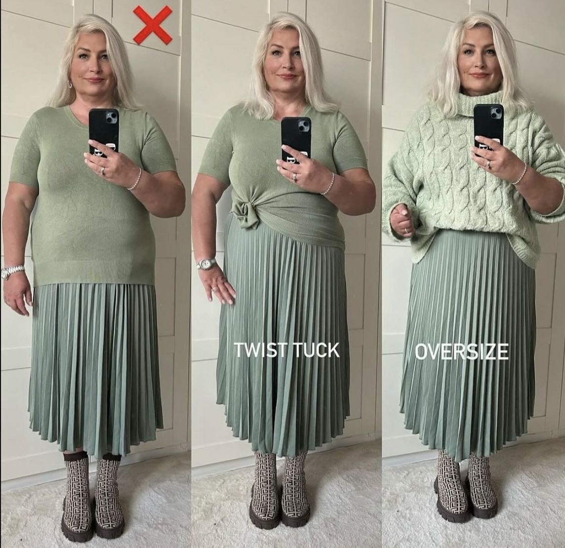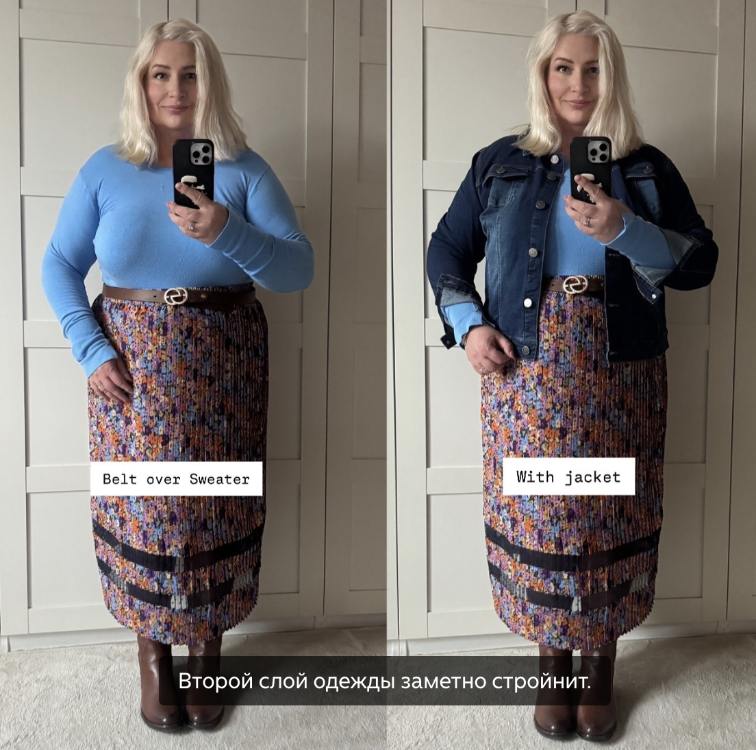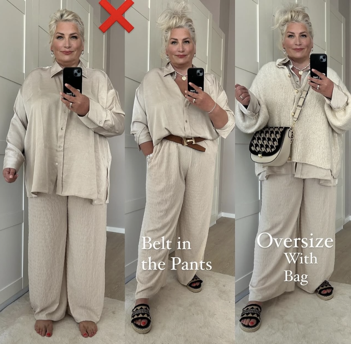 А дальше начинается магия. Джаннетт придумала ещё несколько способов, чтобы подчеркнуть талию в объемной одежде. Расстегнуть несколько нижних пуговиц, завязать аккуратный узелок или просто надеть ремень. Хотя мне, честно говоря, средний аутфит кажется неудачным — слишком плотный кардиган крадёт всё изящество и делает талию визуально шире.