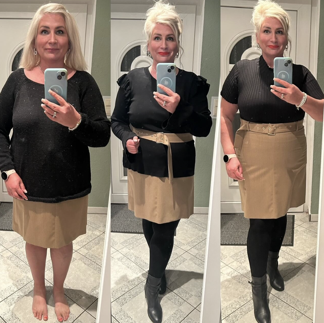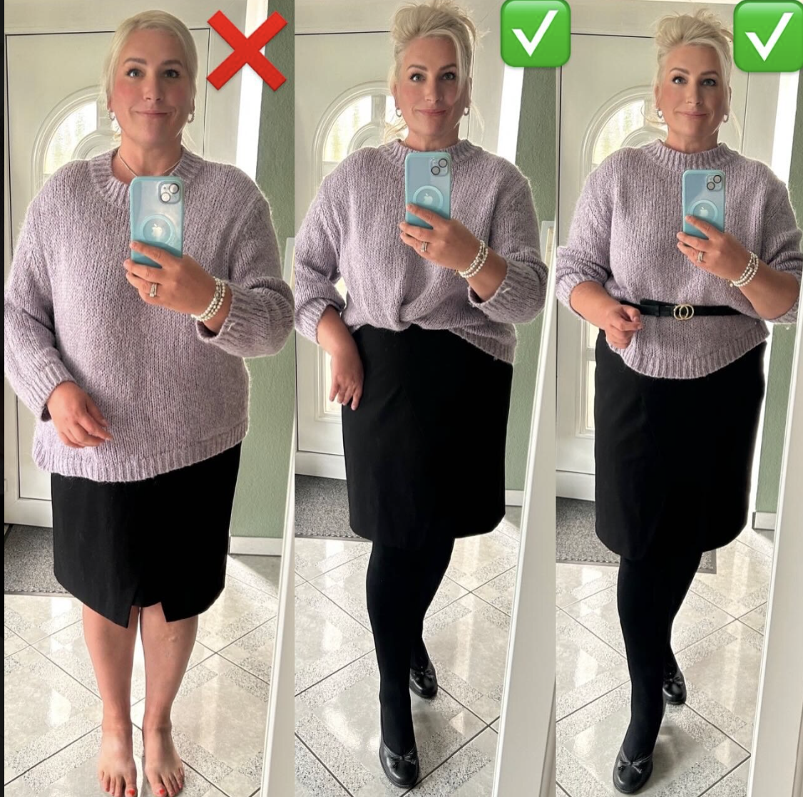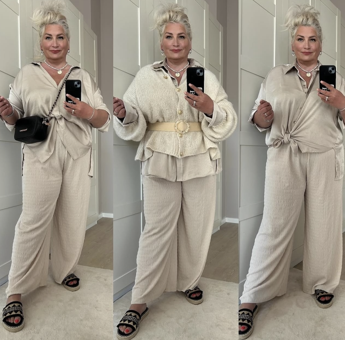 А дальше начинается магия. Джаннетт придумала ещё несколько способов, чтобы подчеркнуть талию в объемной одежде. Расстегнуть несколько нижних пуговиц, завязать аккуратный узелок или просто надеть ремень. Хотя мне, честно говоря, средний аутфит кажется неудачным — слишком плотный кардиган крадёт всё изящество и делает талию визуально шире.