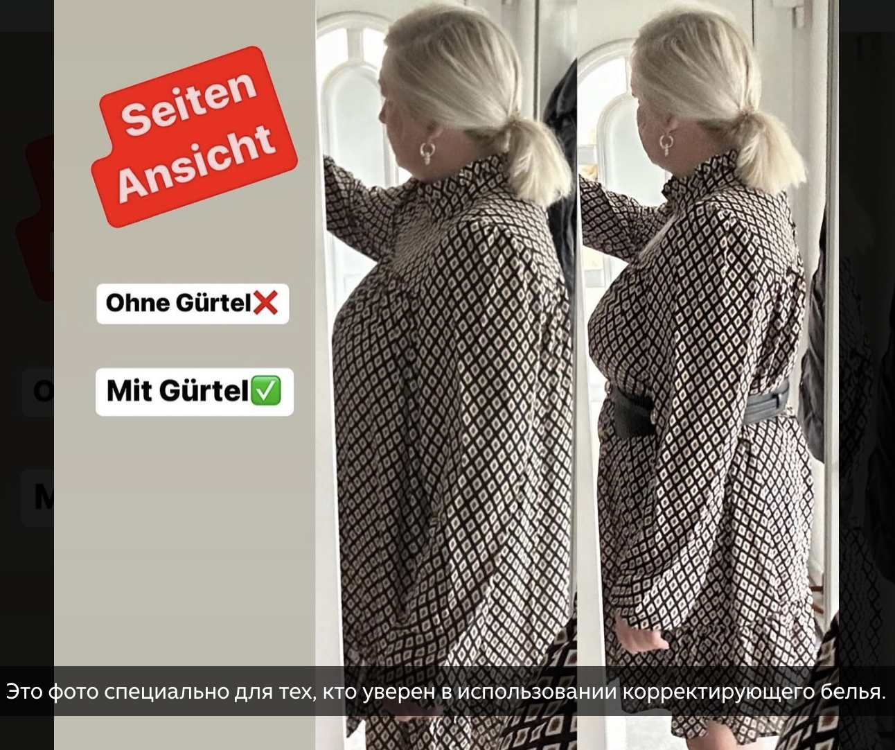 В комментариях ей часто пишут, что весь секрет не в правильном подборе одежды, а в выгодном ракурсе и утягивающем белье. Поэтому она выложила фото, на котором стоит к камере боком и очевидно, что никакого обмана здесь нет. Тем более, в её аккаунте я нашла фотографию только в нижнем белье и это правда такая фигура. Да, эти приёмы — не панацея и в профиль живот будет заметен. Но уже не так сильно, как если бы она его обтянула тонким трикотажем.