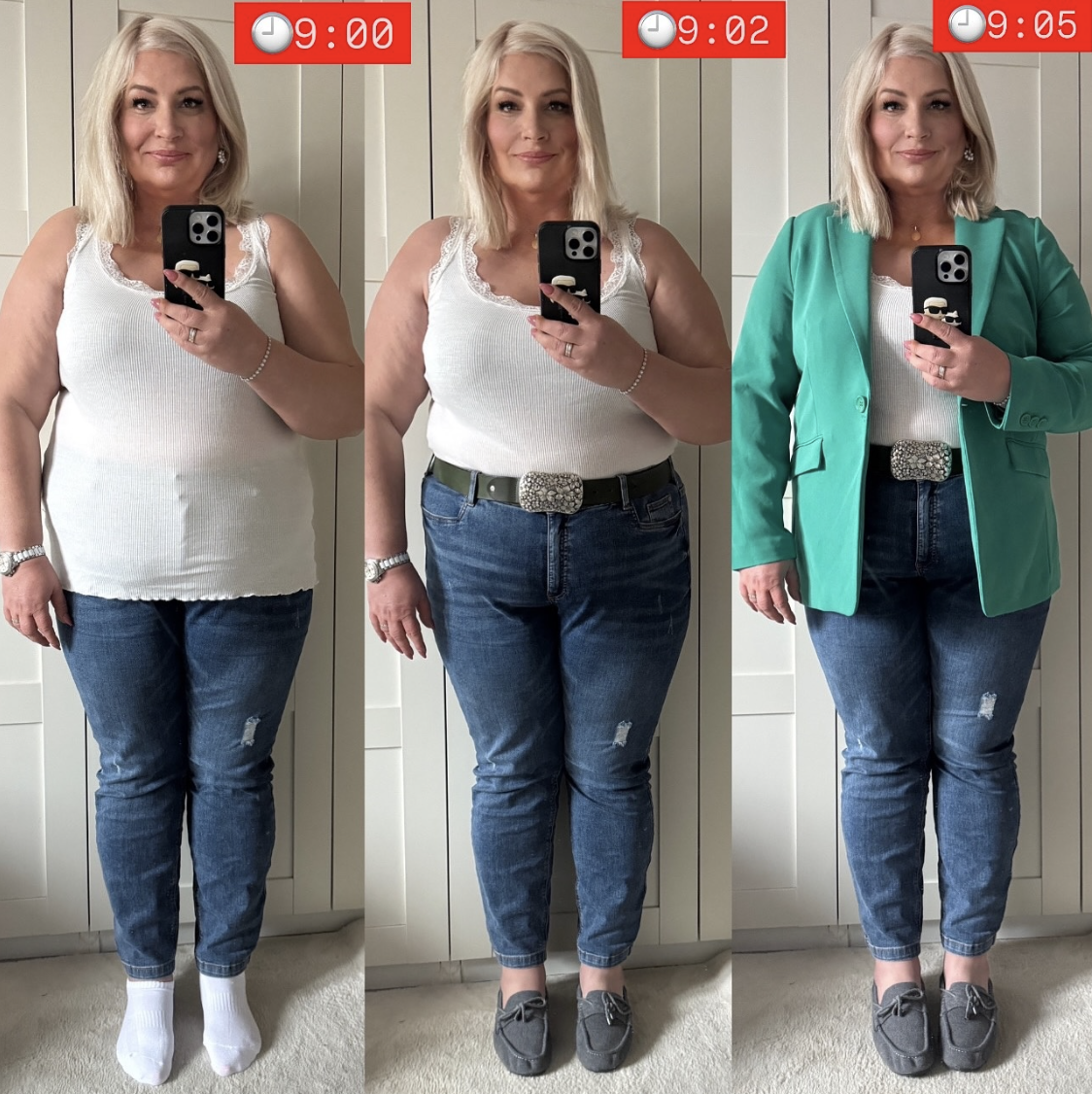 Любите скинни и обтягивающие майки, но фигура не позволяет такое носить? У этой дамы и здесь есть решение. Вместо того, чтобы носить эластичную майку навыпуск и акцентировать выступающий живот, лучше заправить её в джинсы. А сверху добавить акцентный ремень и жакет из плотного костюмного материала, который держит форму. Конечно, стройнее на пару размеров она не стала — в облегающих вещах такого эффекта достигнуть сложно. Но это явно гармоничнее, чем в первом варианте.