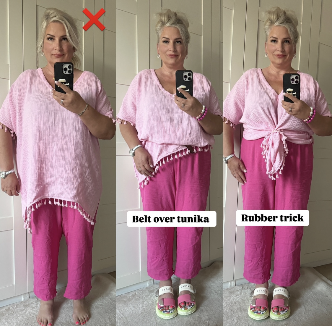 Летние варианты стилизации объёмной туники. Разумеется, если носить её навыпуск, тело визуально расширится вдвое и вместо маскировки живота, мы нарисуем себе ещё один. Смотрите, как делает Джаннетт: она заправляет тунику в брюки, но нарядный низ с декоративными кисточками оставляет наружу. Лично мне, этот способ нравится больше всего, так как нет лишнего объёма от узлов.