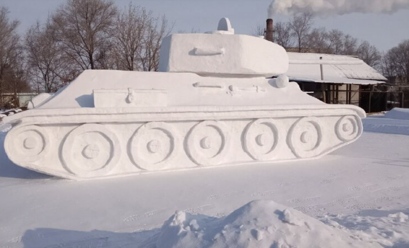 В селе Константиновка Амурской области местный житель Юрий Потапчук вместе со своим внуком-пятиклассником, построил на своем участке полноразмерную снежную копию легендарного танка Т-34-85.