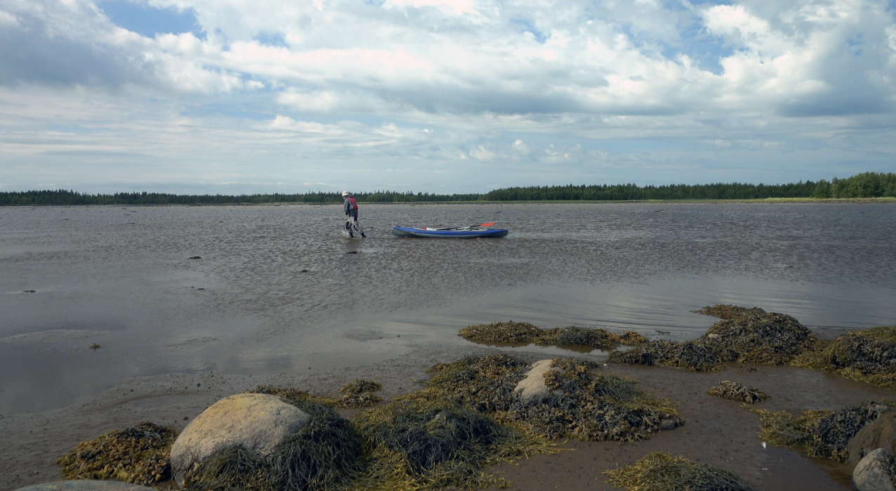 Море в районе кемских шхер довольно мелкое. Поэтому в отлив вода уходит от берега на расстояние в десятки и даже сотни метров. Некоторые проливы между островами в это время превращаются в заполненные жидкой грязью пространства. Замешкался немного — и можно влипнуть, в буквальном смысле этого слова. Тут уже приходится изрядно попотеть, перетаскивая вещи и байдарку по липкой грязи до земной тверди, или временно стать бурлаком, дабы дотащить байдарку до воды.