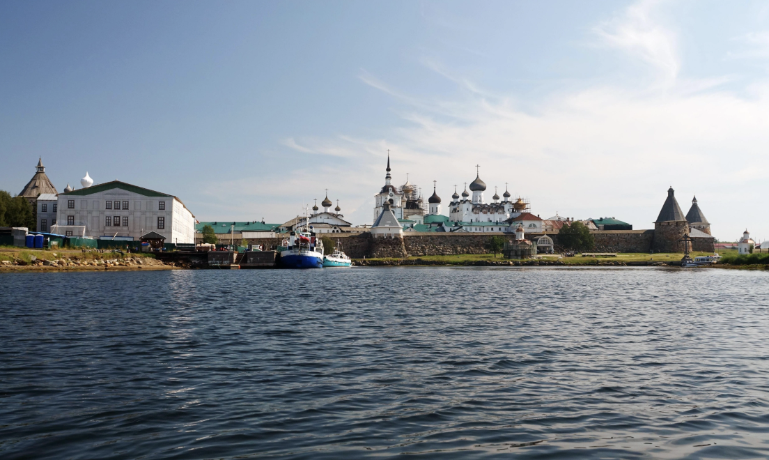— На Кузовах, — рассказал нам Евгений, — мне удалось попасть на катер, который вез на Соловки группу туристов. Время в пути туда — около часа, если при хорошей погоде. Катера на Соловках причаливают в бухте, носящей название Гавань Благополучия. Всех прибывающих на остров встречает древний Соловецкий кремль. Возраст его — свыше четырех веков. Множество драматических событий прошлого помнят его каменные стены. А из-за них виднеются купола церквей еще более древнего Соловецкого мужского монастыря, основанного в 1436 году. С противоположной стороны к стенам Соловецкого кремля подступают воды озера Святого. Соловецкий архипелаг состоит из шести крупных островов — Соловецкий, Анзерский, Большая Муксалма, Малая Муксалма¸ Большой Заяцкий и Малый Заяцкий. Кроме них, в состав архипелага входит еще около сотни мелких островков.
