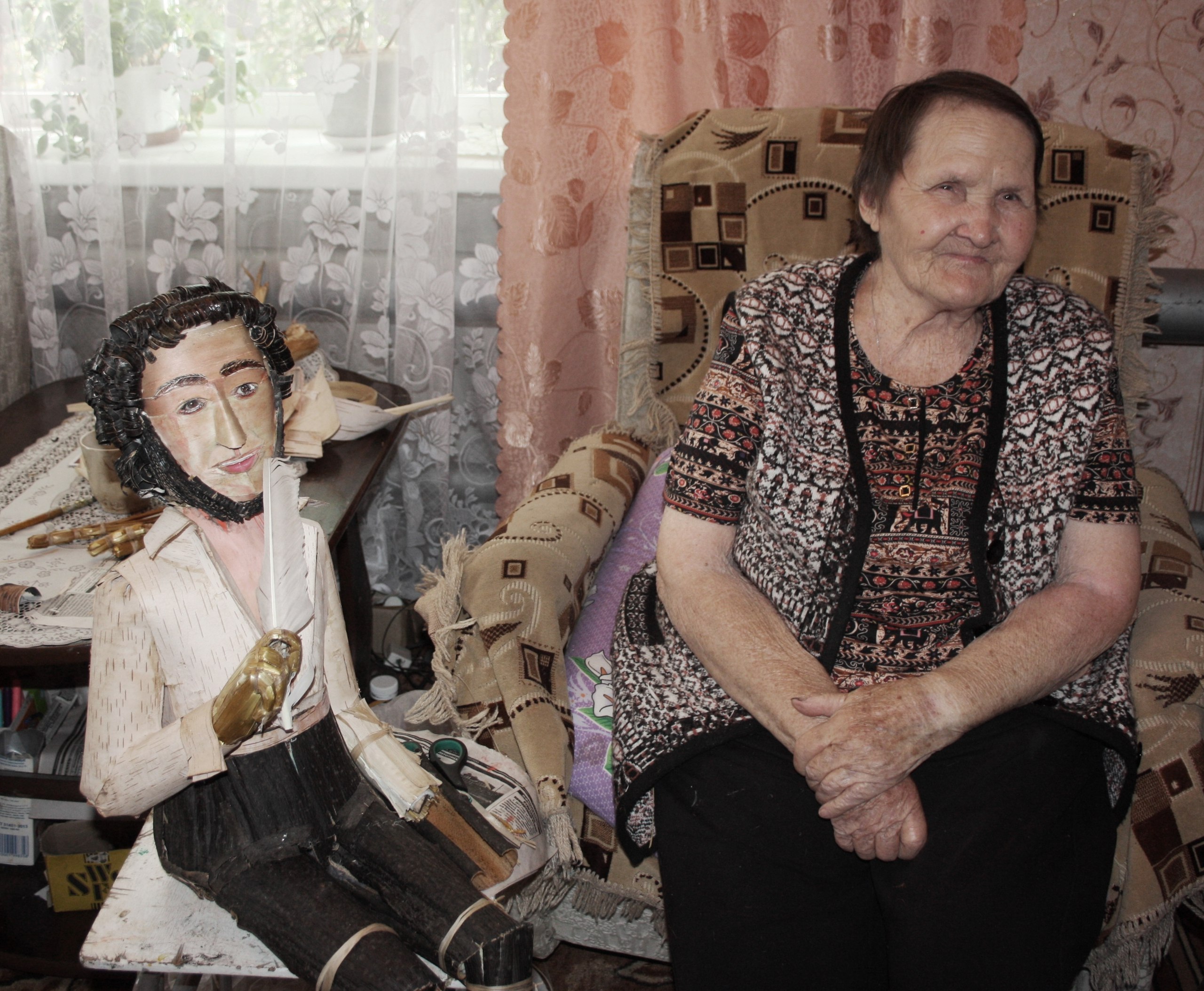 Вот и я, увидев работы Надежды Яковлевны в краеведческом музее Абдулино, не могла оторвать от них глаз. Барышни в мордовских и русских нарядах, паренек с балалайкой, ткачиха за станком, юный Пушкин с няней Ариной Родионовной. И все это живое, с характерами, отраженными на берестяных лицах! Захотелось познакомиться с автором персонажей, назвать которые куклами просто язык не поворачивался, лично. В музее любезно дали контакты Калининой, предупредив, что ехать придется далеко, а мастерице уже 93 года и она инвалид. Когда журналистов останавливали расстояния и возраст героев? Созвонились, договорились о встрече — и в путь!