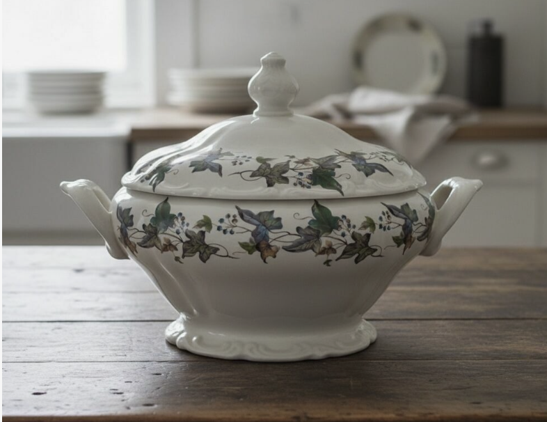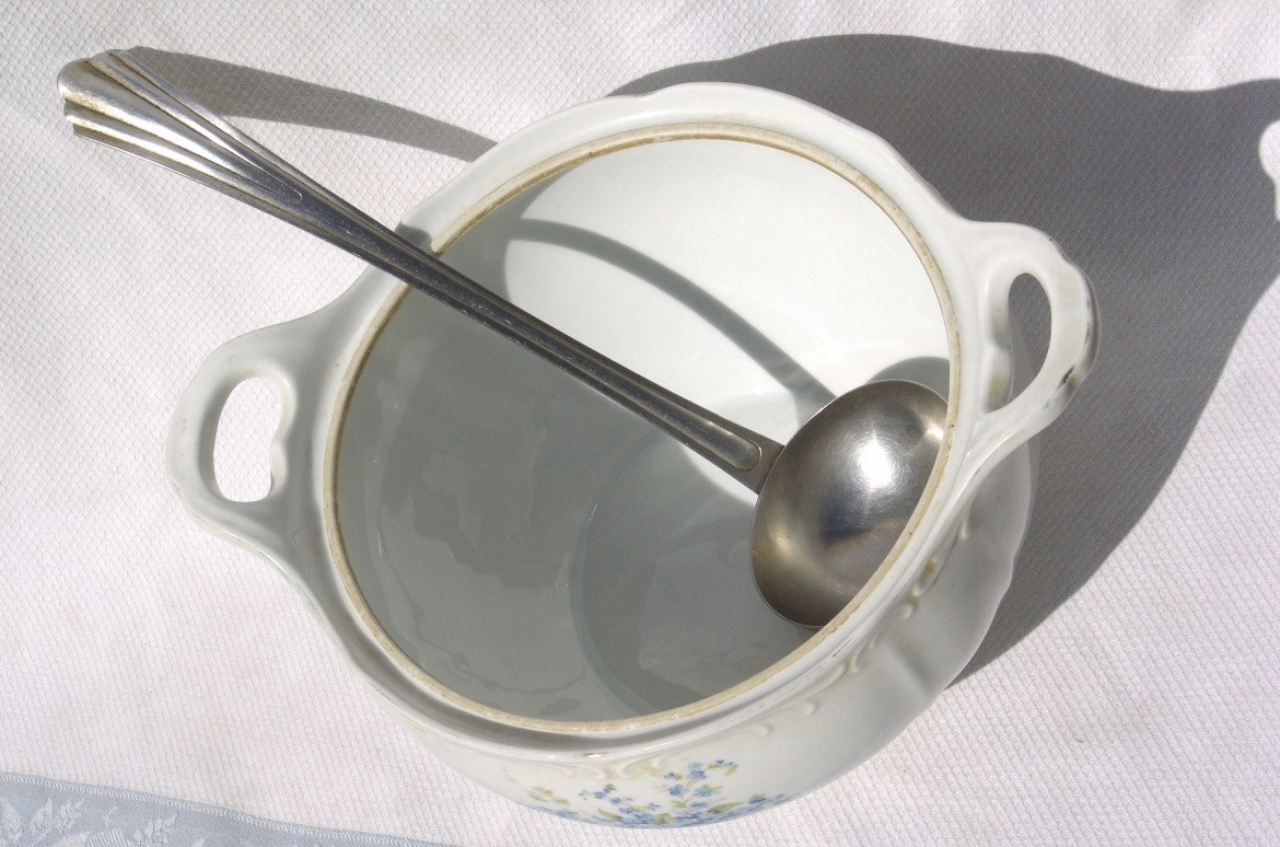 Может быть, помните, в каждом столовом сервизе в 60-70 г.г. была супница. У нас был чешский сервиз на 12 персон, с желтыми такими тонкими цветами и зелеными с золотом листьями. Родители поженились в шестьдесят шестом и сразу купили его. Да, и вот супница в том чешском сервизе тоже, разумеется, была. И даже была, кстати, масленка с крышкой, салатники, блюдо и разные соусники.