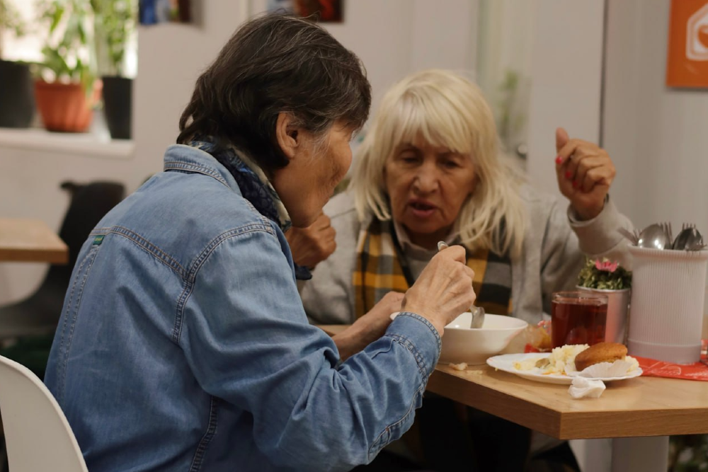 Медленно приоткрывается дверь, нерешительно входят две пенсионерки: "Мы просто посмотреть зашли, что тут да как", - и разворачиваются на выход. Но симпатичная девушка на входе решительно перегораживает дорогу: "Да куда же вы? Проходите, пообедайте: у нас вот и супчик горячий, и второе, все есть. Попробуйте! Или просто чайку выпейте, с печенькой".